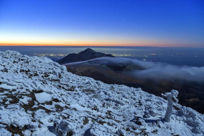(講評)韓国岳から望む、荘大な景観です。朝焼けと青い空が美しく、雲の流れと澄んだ空気は悠久の時を感じます。遠くに町の灯りが輝き、自然との共存の大切さを思わせます。
