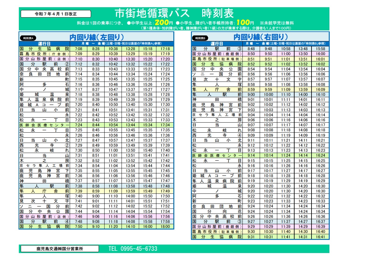 平日運行ダイヤ(JPG:475KB)と土日祝日運行ダイヤ(JPG:240KB)とあります。市役所周辺から隼人見次、鹿兒島神宮、隼人日当山地区、医師会医療センター、隼人姫城地区、国分新町地区などを通って市役所周辺に戻ります。