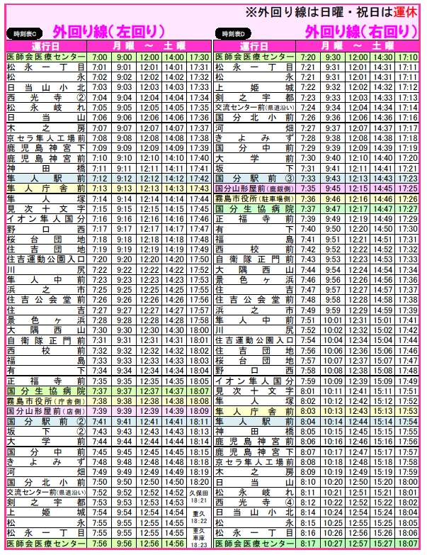 月曜日から土曜日に運行し、医師会医療センターが発着場所です。経由地は、市役所周辺のほか、国分清水地区、自衛隊前、隼人住吉地区、隼人駅前などです。(外回り線時刻表(JPG:381KB))