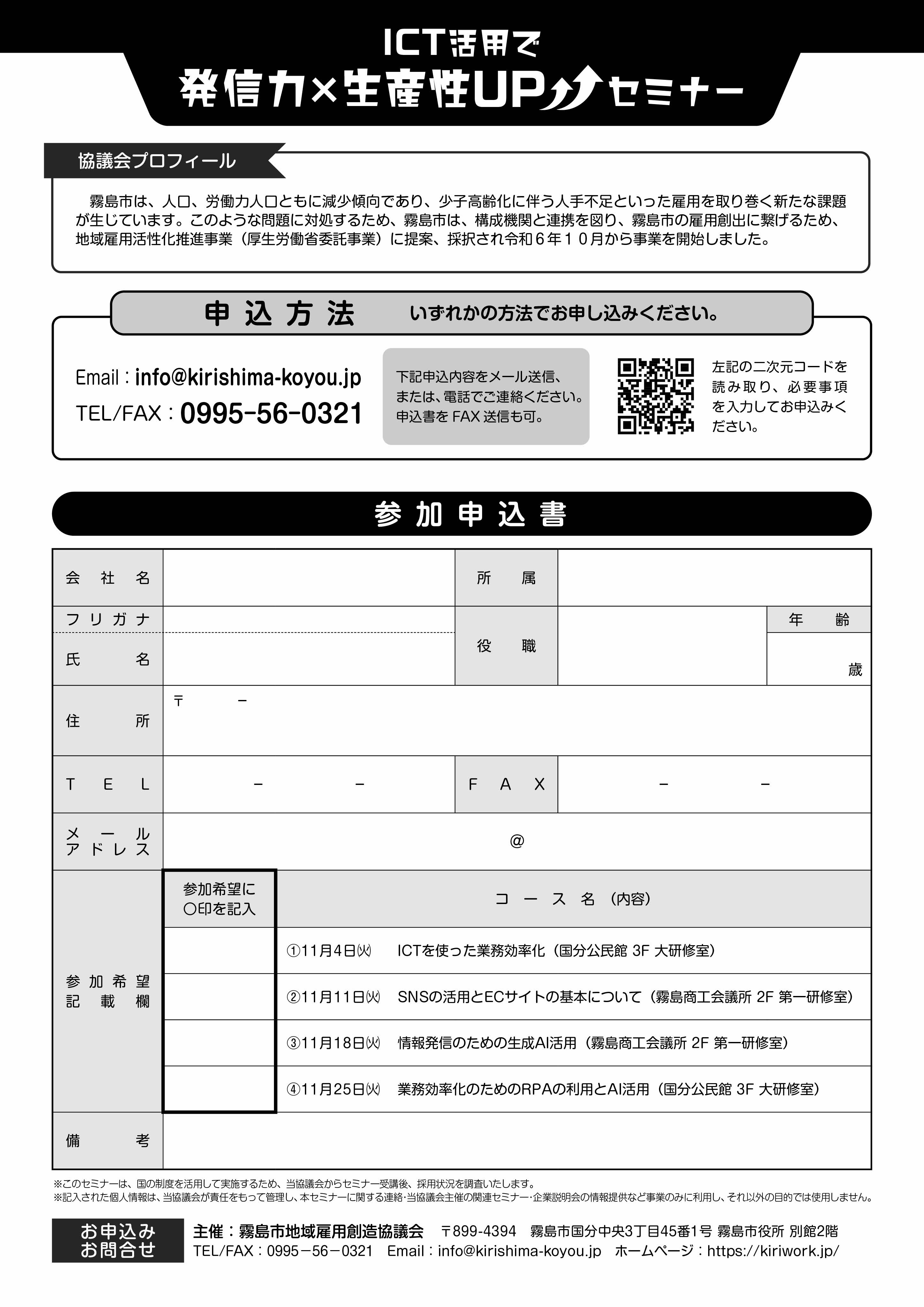 ホーム > まちづくり・産業・企業誘致 > 雇用・労働 > 霧島市地域雇用創造協議会 > 【事業者向け】【11月4日・11日・18日・25日】「ICT活用で発信力×生産性UPセミナー」を開催します